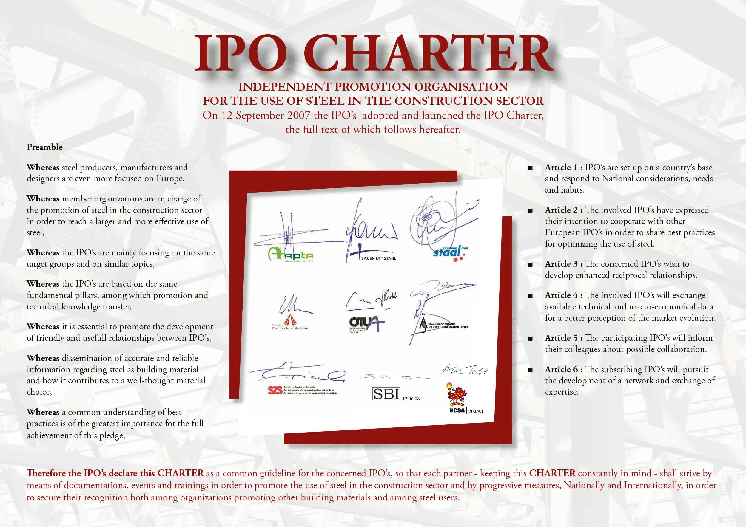 On September 16, 2007, Bouwen met Staal (The Netherlands),  Infosteel (Belgium & Luxembourg), ConstruirAcier (France), bauforumstahl (Germany), Promozione Acciaio (Italy), APTA (Spain), SZS (Switserland), have signed a Charter as a common guidline.