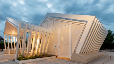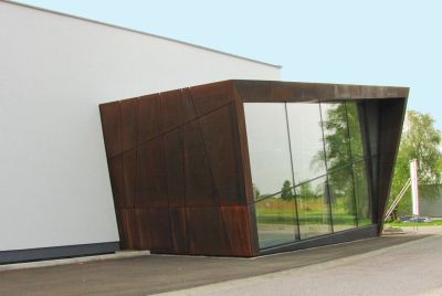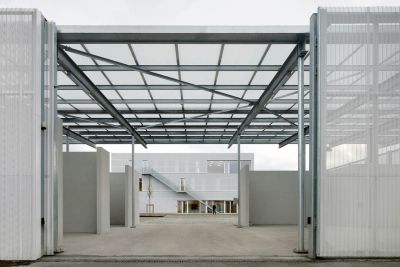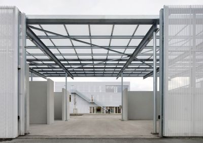 • Ondertitel: Un préau aérien comme une sculpture sur une toiture-vitrine