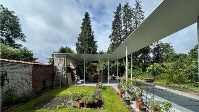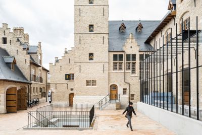 • Tekst: <p>Le pavillon d’accueil du musée Gruuthuse (Bruges) fait revivre la cour ancestrale située entre l’église Onze-Lieve-Vrouw, le palais Gruuthuse et le musée Oude Steen, renforçant l’aspect historique du site. <br />Dans ce contexte d’une valeur patrimoniale exceptionnelle, le pavillon se profile comme une construction contemporaine - un exosquelette d’acier et de verre - tout en faisant écho à l’expression formelle (néo)gothique des monuments environnants. <br />Il est conçu comme une structure métallique pliée, selon le principe structurel de la ‘folded plate’. Les plans du toit sont en acier plat de 6 mm et les colonnes en acier plat de 8 mm. Les plus grandes surfaces inclinées de l’auvent sont renforcées localement avec des ailettes soudées de 10 mm d’épaisseur. Les semelles IPE 100 fournissent la rigidité nécessaire dans les plans verticaux frontaux. Les détails minutieux de la structure métallique renforcent l’expression architecturale.</p>
