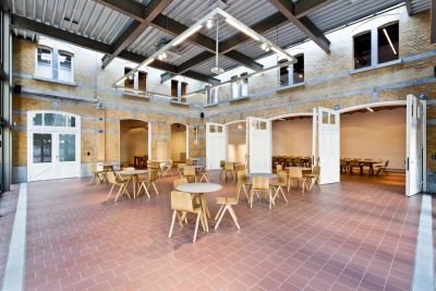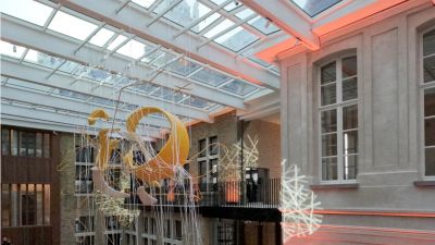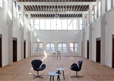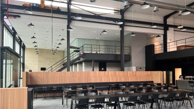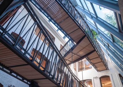 Une charpente métallique caractéristique crée une synergie entre l’ancien et le nouveau