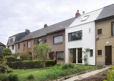 • Tekst: <p>Au centre de Bruxelles, cette habitation privée s’est vue radicalement transformée grâce à l’ajout en façade arrière d’une extension en acier (4 x 4,5 x 6 m haut ; ± 4500 kg) conçue d’une seule pièce avec escalier intégré. <br />La préfabrication en atelier (3 semaines + 1 semaine de mise en peinture) a permis d’installer le nouveau module en 3 heures seulement. <br />Cette annexe se compose d’une simple tôle d’acier de 5 mm d’épaisseur, raidie par un ensemble de 5 portiques de 20 mm d’épaisseur pour 100 mm de large. Cette structure épurée permet d’optimaliser l’espace généré par l’intervention. Avec mise en peinture en atelier, l’acier devient la signature visuelle et la peau intérieure du projet. Par ailleurs, la coque en acier est étanche et sert donc de pare-vapeur naturel vis-à-vis de l’isolation extérieure qui l’entoure totalement. L’acier étant recyclable à 100 %, on peut imaginer que le module puisse à l’avenir être extrait du projet et recyclé intégralement.</p>