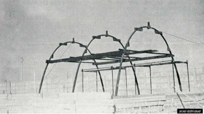 • Tekst: <p>Ayant pour fond une grande mosaïque rouge et noire, l’architecte trace une ligne ondulée apposée sur une série de fines petites pattes ; un abri recouvrant une tribune existante de 50 m de long. Le dessin est tout simple : une tôle de 15 mm d’épaisseur et 45 colonnes de support en acier de 55 mm de diamètre sont disposés de façon plus ou moins aléatoire sur les trois gradins que comportent la tribune. La courbe a été optimisée pour éviter le flambement dû à la poussée latérale causée par le poids des tôles. Celles-ci ont été cintrées en atelier et assemblées sur place en dix parties de cinq mètres sans que les fixations entr’elles ne soient visibles, grâce à l’utilisation de boulons à tête fraisées enfoncés dans les tôle qui en leurs extrémités se chevauchent à mi-épaisseur. Les colonnes doivent soutenir la toiture à la fois verticalement et horizontalement. Comme les 15 colonnes de la rangée de devant se trouvent approximativement au milieu de l’auvent qui fait 5 m de profondeur, elles en supportent presque tout le poids. En revanche, les colonnes situées à l’arrière, qui ne portent qu’une faible proportion de la charge, réagissent de manière plus rigide aux poussées horizontales et font office de contreventements.</p>