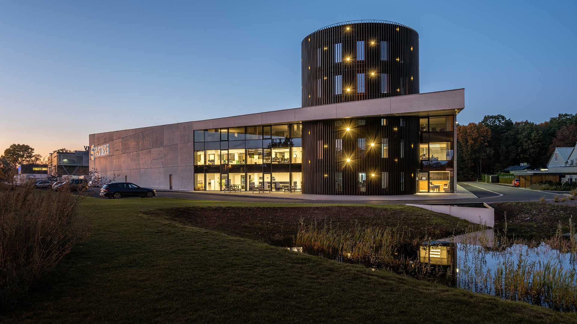 L’auvent sert de protection solaire fixe pour les bureaux. En conjonction avec les ailettes verticales qui recouvrent la tour, le problème de surchauffe est pratiquement résolu. Ayant à faire face à une portée de près de 20 m, le choix a été fait de réaliser l’auvent entièrement au moyen d’un assemblage de treillis d’acier 3D. C’était à la fois la meilleure solution structurelle mais aussi la plus économique et la plus svelte. Les profilés en L et en T ont été boulonnés/soudés les uns aux autres en atelier pour réaliser ainsi des unités plus grandes, qui ont ensuite été assemblées sur place. L’entièreté de la structure en treillis d’acier 3D est portée par la tour ronde. Des colonnes d’acier ont été fixées à la façade pour transférer les forces de l’auvent aux parties inférieures des étages. En parachèvement, le dessous et les bords de l’auvent ont été recouverts de panneaux sandwich. Un revêtement plat et fin supplémentaire a été fixé à l’avant-toit afin d’obtenir un aspect uniforme avec les murs en béton.