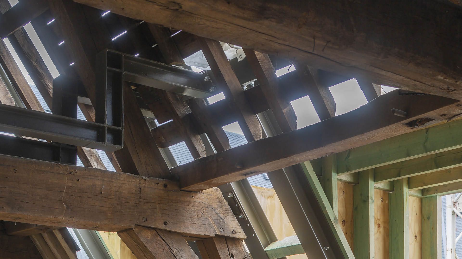La charpente existante était pourvue d’une peau autoportante et isolante, soutenue par des fermes métalliques. Celles-ci sont à leur tour couplées aux poutres de soupente horizontales de la charpente en bois existante. Les fermes métalliques ont été rendues aussi invisibles que possible pour faire ressortir au maximum l’authentique grenier de la bibliothèque. De plus, l’acier restant a été éliminé, à l’exception des colonnes des planchers de la mezzanine. Au total, environ 160 tonnes d’acier S355 ont été utilisées sous forme de profilés laminés à chaud.