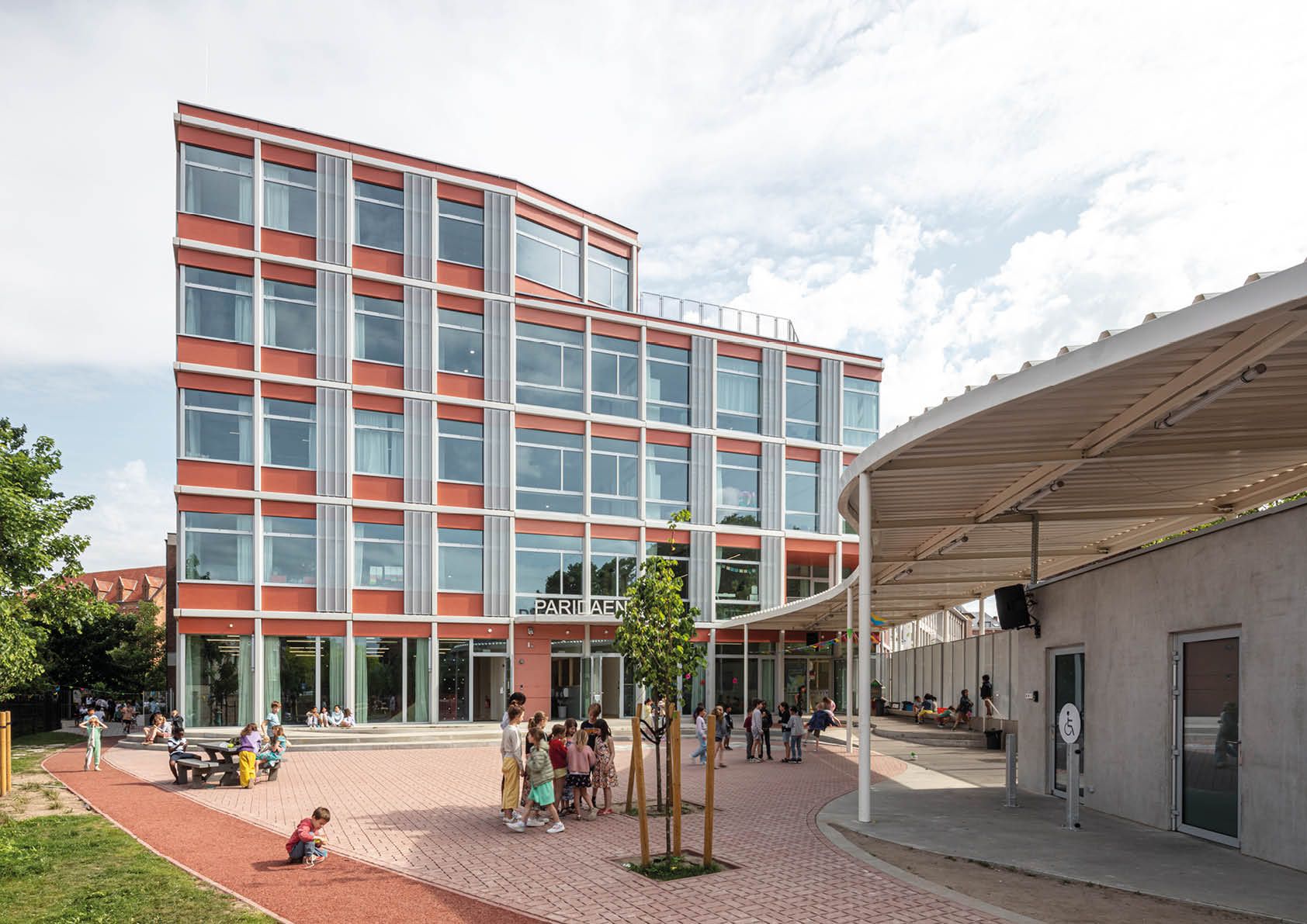 La réalisation de la nouvelle aile de l’Institut Paridaens constituait la dernière phase d’un masterplan global. Cela a donné au campus un aspect proéminent dans la ville, en tant que repère visuel et orientationnel. Un grand auvent aux formes fluides a été fixé aux structures existantes et complète le tableau.