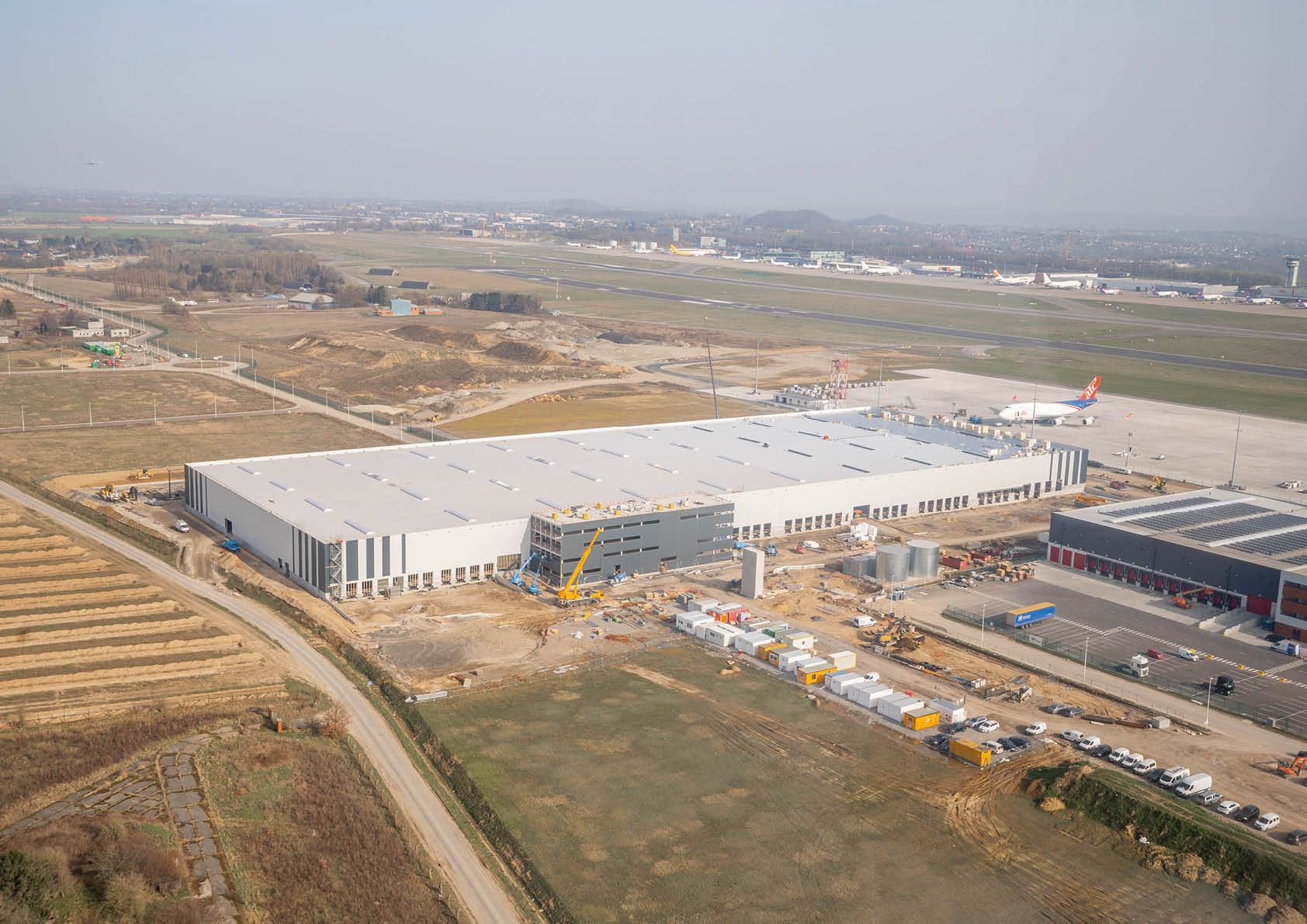 Ce projet de grande envergure comprend notamment un immeuble de bureaux de 3200 m2 en béton préfabriqué, ainsi qu’un immense hall logistique en acier de 30.000 m2. Ce dernier est composé d’un maillage régulier des colonnes de 28x266m. L’ensemble des poutres de toiture, principales et secondaires, sont des poutres treillis en acier, traitées avec une peinture REI30 pour la résistance au feu. Après étude spécifique, c’est l’acier S275 qui s’est avéré être la solution la plus économique.
