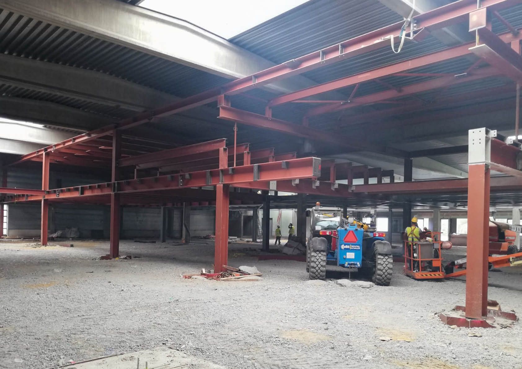 Avant de commencer les travaux, une nouvelle fondation indépendante a été réalisée, au moyen de tubages pleins en acier. Compte tenu de la structure dans le bâtiment existant, la longueur et le poids maximal des poutres en acier devaient être limités. Au total, pas moins de 565 tonnes d’acier ont été utilisées pour les planchers de l’étage, y compris un traitement ignifuge complet (plus de 10 500 m² de peinture ignifuge). Au-dessus de la structure en acier, 2 700 m² de planchers à grille et 1 250 m² de planchers à queue d’aronde (Cofrastra) ont été installés.