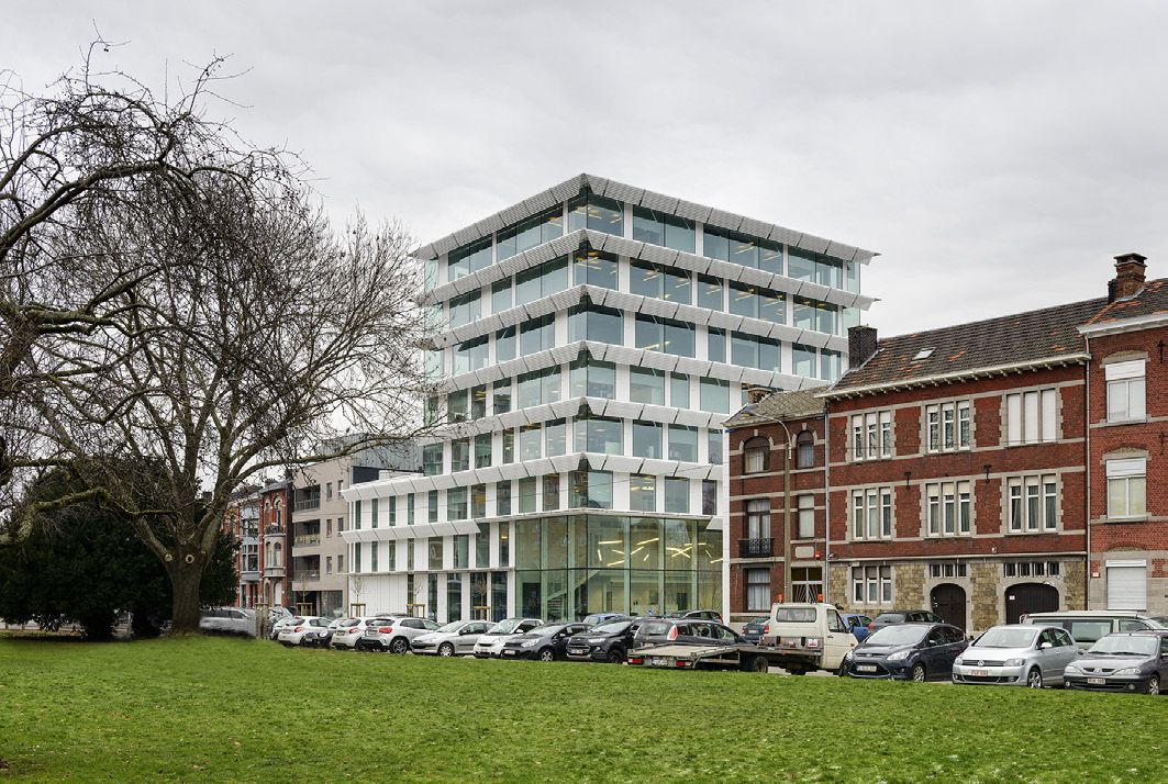 Le bâtiment regroupe 3.300 m2 de bureaux, des salles de conférences, un restaurant et une brasserie, 2 niveaux de parking de 145 places enterrés. Le défi fut d’intégrer 7 étages de bureaux dans un gabarit urbanistique qui à priori n’en permettait que 6. Ceci ne fut possible que grâce à la charpente périphérique en acier autour du noyau central en béton. Elle est constituée de profils PRS (S355) et permet de réduire le complexe entre étage à 30 cm.