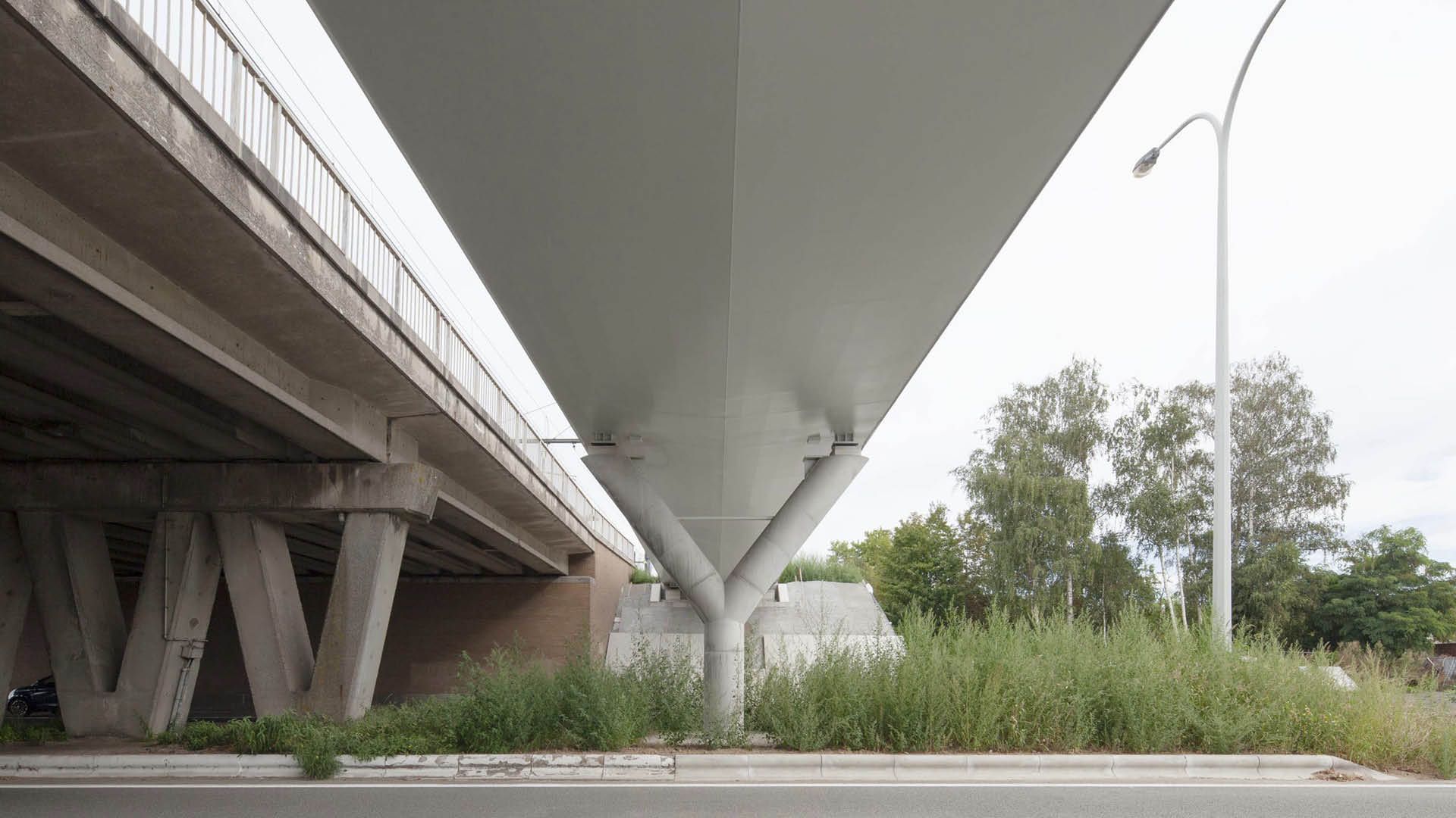 Les trois ponts cyclistes en acier répondent au même langage formel. Une section transversale épurée composée d'éléments purement structurels en tôle d'acier, réunis dans une forme architecturale simple. Pour le pont cycliste au-dessus de Volhardingslaan, la portée totale de 42,50 m est divisée par deux grâce à l'installation d'un pilier central en béton à fourche.