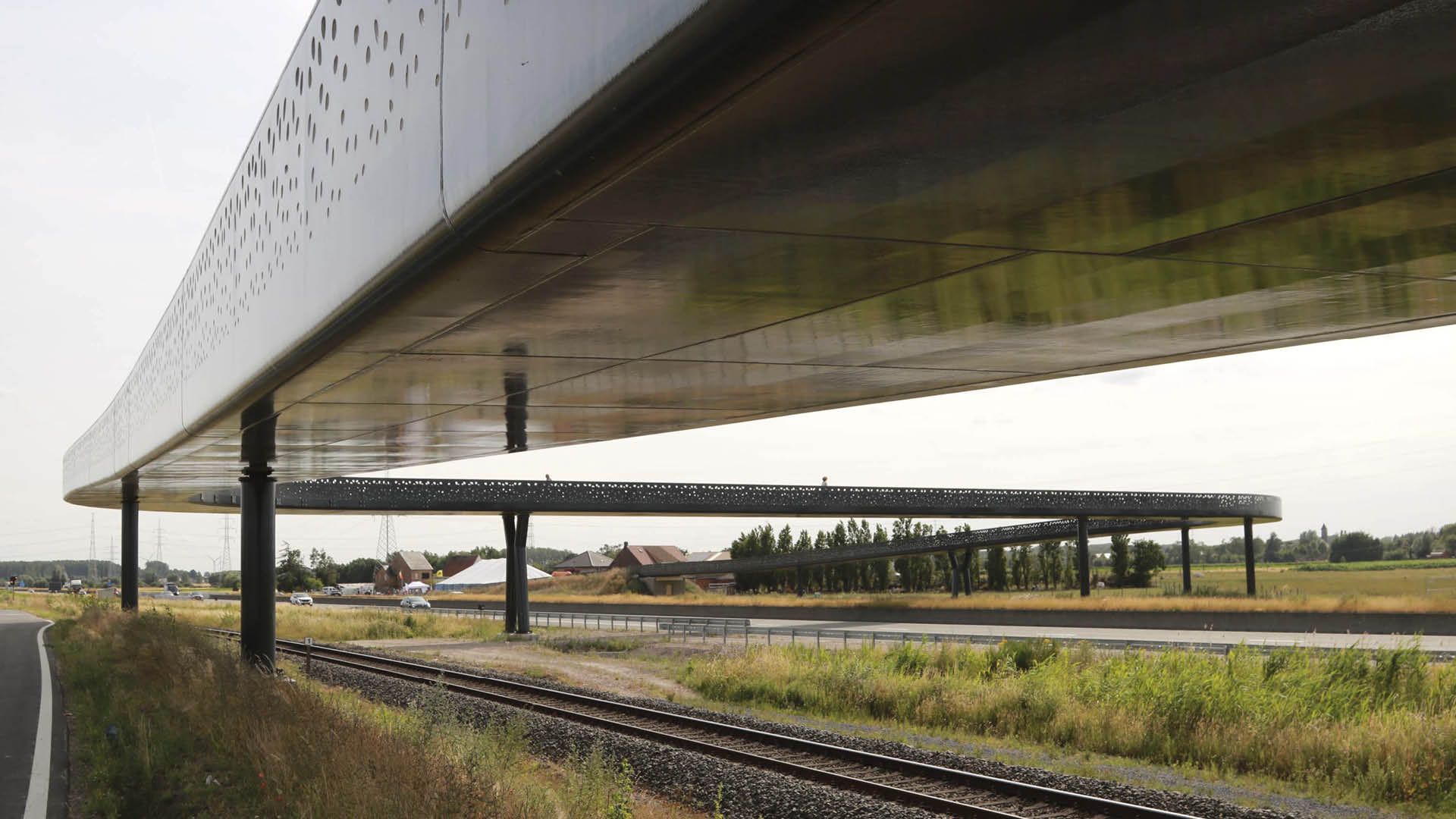 Le long du R4 Ouest près de Gand, deux ponts cyclables ont été réalisés en prévision de la transformation du R4 en route principale : le pont de Zandeken et le pont de Hultjen. Ces ponts, tous deux dotés d'une section transversale en forme de U et d'un motif de trous unique dans les tôles du garde-corps, constituent un ajout esthétique et fonctionnel au paysage. Leur couleur, gris noir à l'extérieur et subtiles nuances perlées à l'intérieur, souligne l'harmonie entre l'infrastructure et l'environnement.