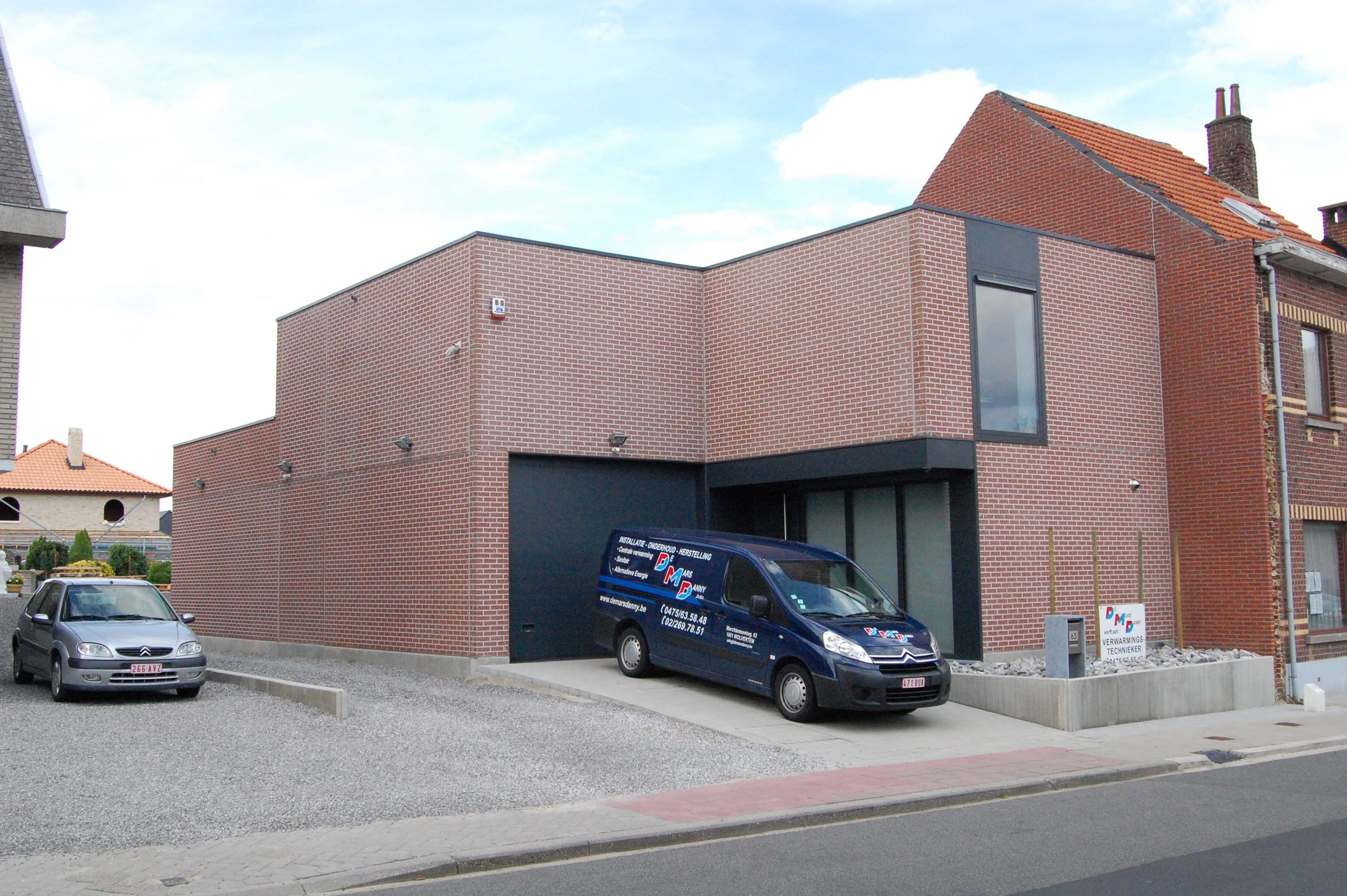 Na jarenlang het ouderlijke huis als uitvalsbasis voor de beroepsactiviteit gebruikt te hebben, zag installateur van sanitair en verwarming De Mars zich genoodzaakt tot afbraak en nieuwbouw. Op het kleine terrein werd een nieuwe opslagruimte met kantoor opgetrokken. De keuze voor een staalskelet lag voor de hand omwille van de snelle plaatsing, de flexibiliteit en een vrije open indeling van de ruimte. De staalstructuur bestaat uit HEA- en IPE-staalprofielen en werd integraal uitgevoerd met een brandwerende coating en eindlaag. Het dak is samengesteld uit trapeziumvormige geperforeerde staalplaten met interne witte coating. Deze structuur werd bekleed met prefabbetonnen sandwichpanelen met baksteenmotief. Het kantoorgedeelte bevindt zich aan de straatzijde, de opslagruimte aan de achterkant. Deze laatste krijgt daglicht via een raampartij bovenaan in de achtergevel. Een kleine overkraging in de zijgevel biedt beschutting aan de inkom en bevat ook de zonwering voor het kantoor.