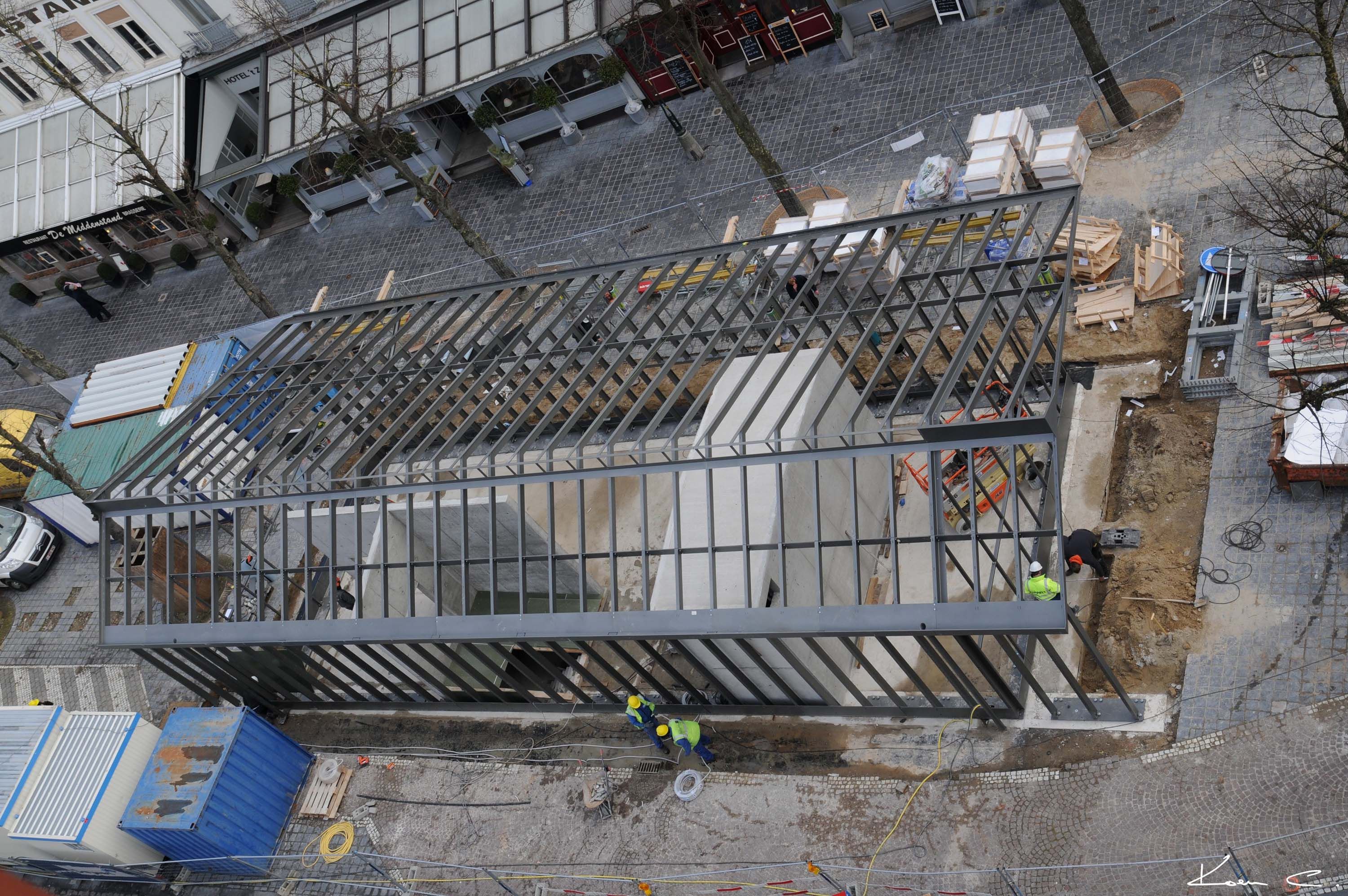 Op het plein 't Zand in Brugge werden vier bestaande toegangspaviljoenen tot de ondergrondse parking gesloopt en vervangen door drie nieuwe. Deze werken gingen samen met de installatie van enkele nieuwe liften en de reorganisatie van de voetgangers- en fietserstoegang. De nieuwe paviljoenen liggen op een brede voetgangerszone met aangrenzende horecaterrassen.