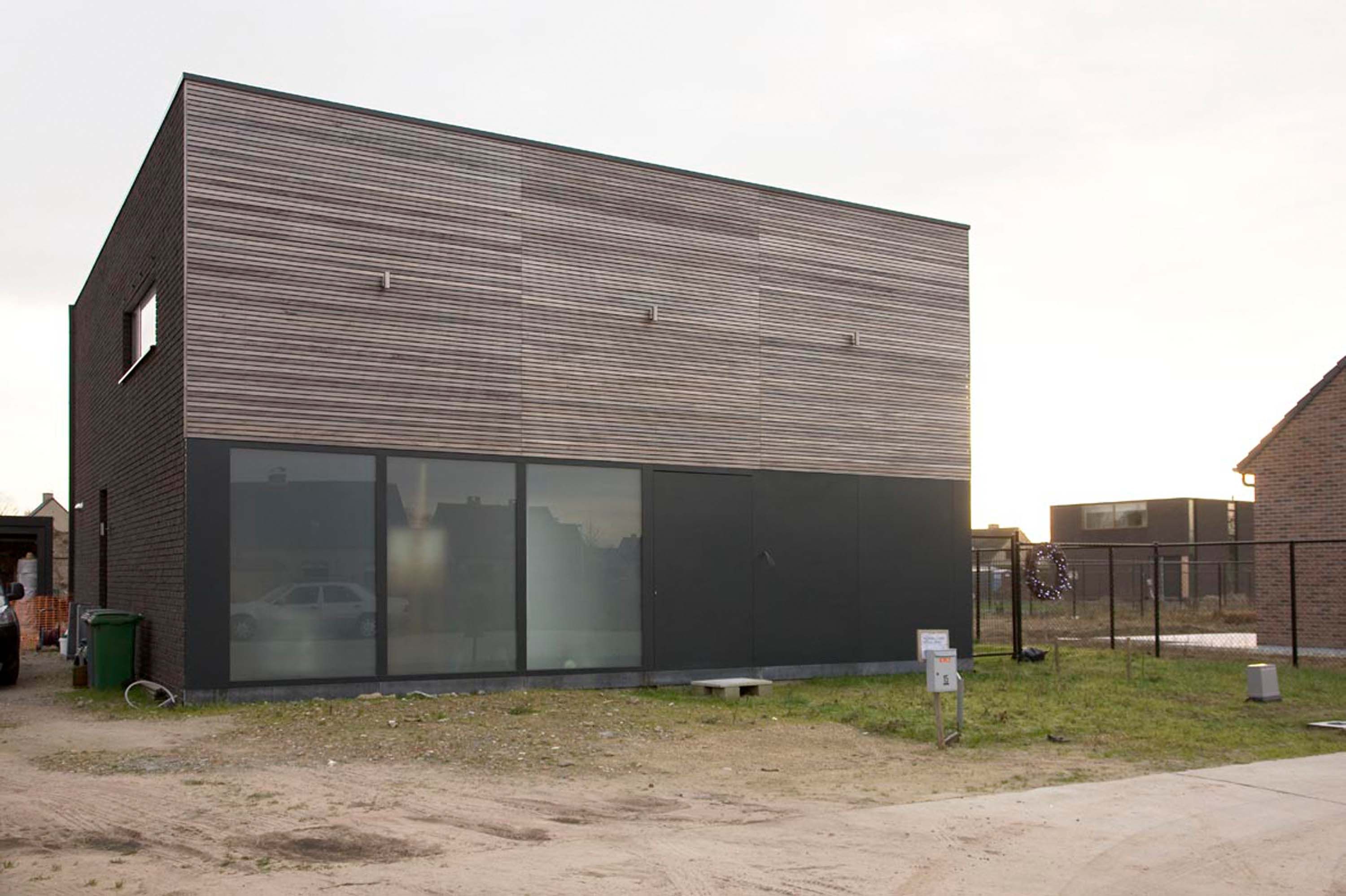 De traditionele gevelmaterialen van deze woning, geplaatst omwille van de verkavelingsvoorschriften, contrasteren met de staalconstructie. Binnen blijven alle industriële materialen zichtbaar en worden ze aangevuld met een warme materiaalkeuze en sfeervolle verlichting.