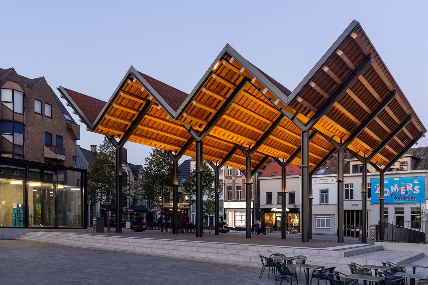 De plus en plus de villes mettent en valeur le rôle et l’identité de leur place principale au centre-ville grâce à de petits projets innovants. Vilvorde n’a pas été en reste : en prévoyant le parking sous la Grote Markt, un espace s’est libéré pour rendre à la place événementielle sa fonction de lieu de rencontre par excellence de la ville. Dans ce cadre, le rôle clé a été décerné à un auvent qui ne passe pas inaperçu.