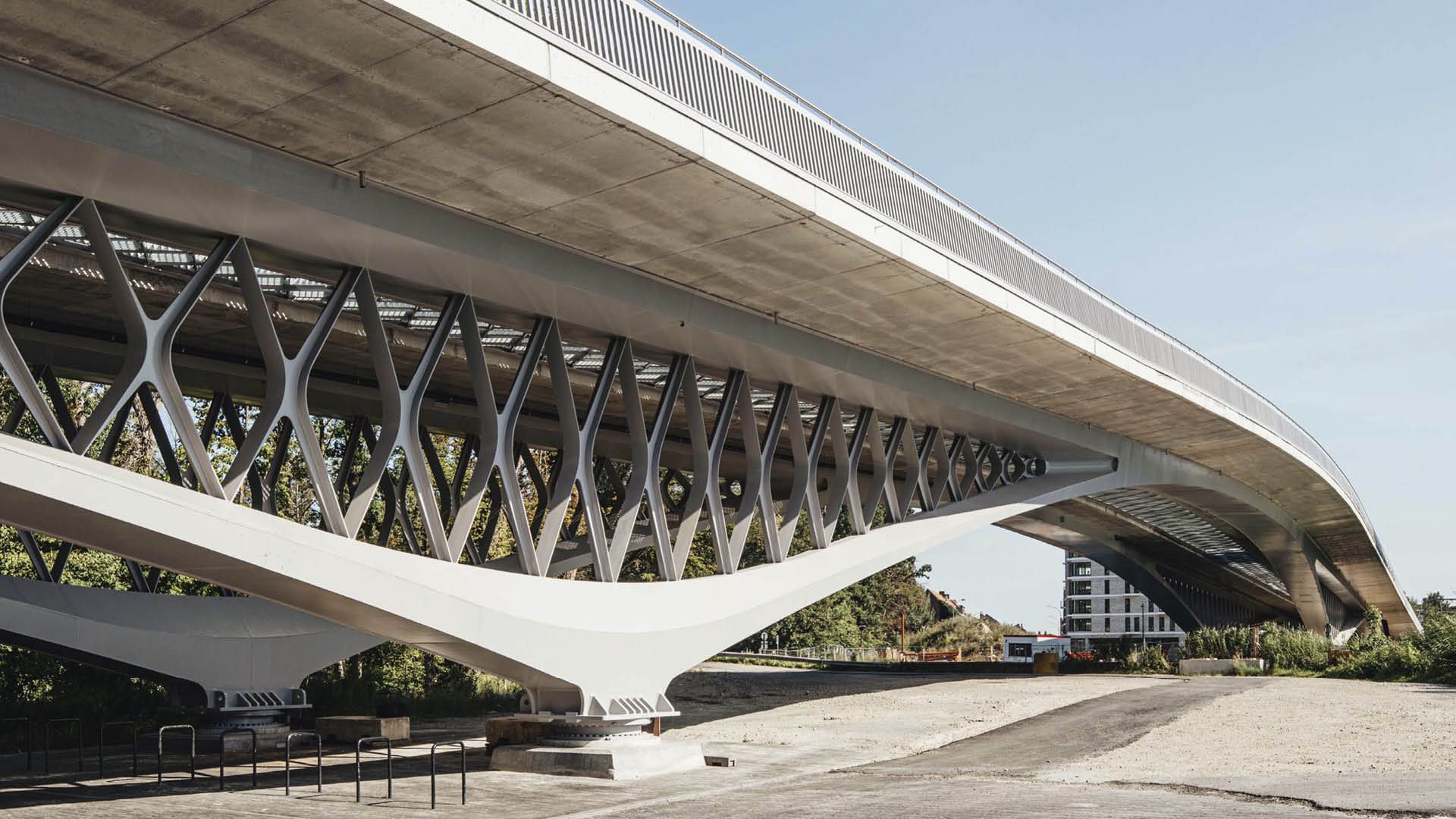 Le pont mesure un peu moins de 300 m de long et se compose d'une structure principale d’environs 1400 t avec un tablier en béton divisé en deux par une grille perméable à la lumière. La structure métallique des arcs continus et des poutres a été dédoublée en deux caissons d’acier parallèles pour supporter la largeur nécessaire du tablier du pont. Chacun des caissons doit absorber indépendamment la torsion de la chaussée située au-dessus. L’espace entre les arcs et les poutres juste en dessous du tablier du pont est rempli avec des diagonales. Cette structure en treillis a donné à la structure métallique la rigidité nécessaire sous des charges asymétriques. Le treillis est constitué de plaques cruciformes découpées et d'une épaisseur de 20 mm, munies d'une semelle extérieure de raidissement d'une épaisseur de 20 mm.