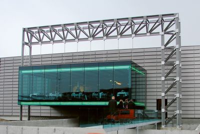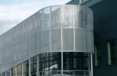 La structure en acier a été construite sur un soubassement massif. Les façades et la couverture de toiture courbe sont revêtues de tôles métalliques profilées, à l’exception d’une partie verticale en cèdre huilé. Les coursives extérieures ont été pourvues de caillebotis en acier galvanisé. Les garde-corps et les couvre-murs sont en acier inoxydable brossé. <br>