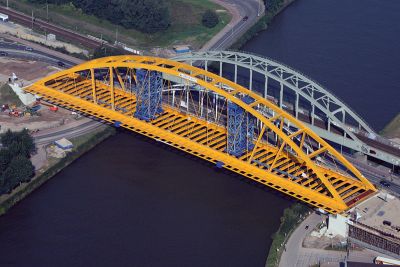 La solution d’un tablier mobile en acier semblait la seule option logique. L’acier a aussi été choisi pour la partie fixe du pont. Les tabliers des deux éléments du pont ont été réalisés au moyen de tôles orthotropes en acier S355 et recouverts d’époxy résistant à l’usure. Les poutres principales de la partie fixe sont des profilés en I, alors que celles de la partie mobile sont soudées en caissons. La partie mobile est équipée de deux triangles debout. L’angle supérieur de chaque triangle est relié à un câble. Le tablier du pont est levé et rabaissé lorsque ces câbles sont enroulés ou déroulés.</p>