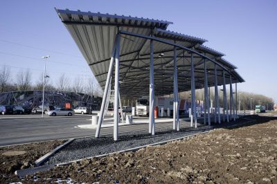 Tekst: <p>La double station-service de Ruisbroek s’étend symétriquement de part et d’autre de l’autoroute E19, aux portes de Bruxelles. La distribution de carburant est implantée à 45° en correspondance avec l’aménagement paysager du site. Elle est protégée par un auvent en acier à couverture courbe formée de cinq facettes longitudinales en bacs nervurés. La structure effilée est constituée de poutres lenticulaires avec câbles de contreventement supportées par des colonnes tubulaires jumelées. Les façades en panneaux acier de la boutique adjacente sont tapissées de photos aériennes monumentales de la ville de Bruxelles et de sa périphérie. La station Est, à la sortie de Bruxelles, est complétée par un bâtiment restaurant et un distributeur d’hydrogène liquide habillé d’acier déployé galvanisé. La station Ouest, vers l’entrée de la capitale, est annoncée par la façade monumentale d’un hôtel (en construction) implanté comme un pavillon dans un parc.</p>