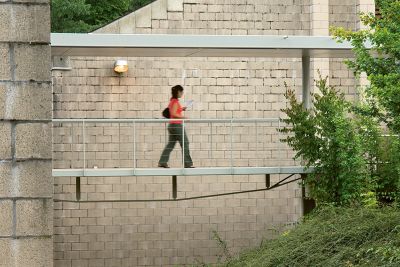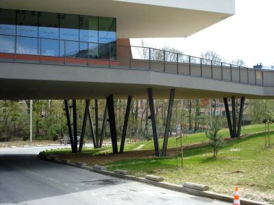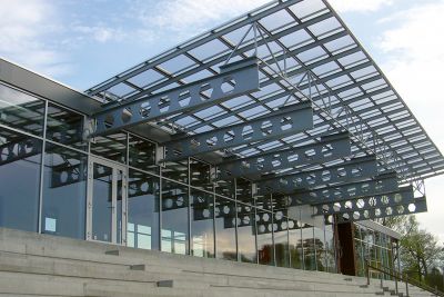 Les escaliers en béton ont été remplacés par une pente d’accès. La réception a été agrandie et entièrement vitrée, et également équipée d’un sas et d’une protection solaire fixe afin d’éviter toute surchauffe en été. Tous les éléments porteurs, ainsi que la surface de la pente d’accès, sont en acier. <br>