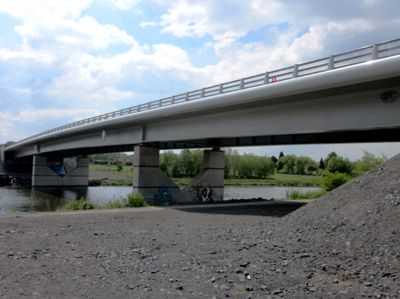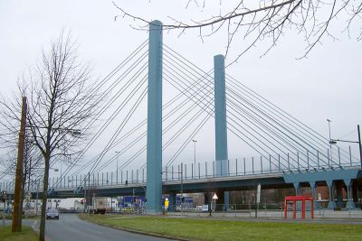 Les pieux de fondation du nouveau pont font face au pont existant. Les travées sont variables et vont jusqu’à 74 m. Il s’agit d’une structure mixte béton-acier. Le tablier en béton armé repose directement sur deux poutres caissons en acier. Les haubans déchargent ces poutres et en font une structure très ouverte. <br>