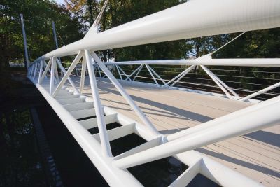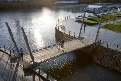 Tekst: <p>L’objectif de la conception de cette passerelle suspendue était de lui conférer une forme à la fois élancée, élégante et dynamique. La structure en treillis spatiale des poutres principales sert en même temps de garde-corps, permettant ainsi d’obtenir une structure en acier ultralégère. Associées aux câbles en acier anticorrosion de 5 mm de diamètre, les poutres treillis 3D offrent une transparence maximale vers l’eau. La structure du tablier en panneaux orthotropes se situe entre les poutres principales et, en raison de sa hauteur minimale, est invisible de l’extérieur de la passerelle. Une dynamique particulière est obtenue par l’obliquité des haubans et des pylônes, ainsi que par le contrepoids cylindrique en plomb. Le poids total de l’acier est de 30 tonnes.
