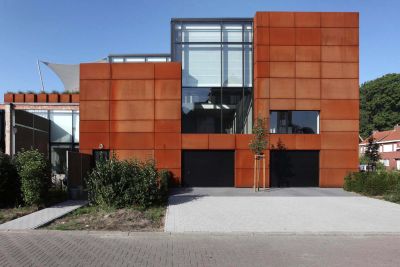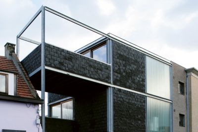 Tekst: <p>L’habitation est constituée de deux volumes imbriqués. La construction en acier a permis de créer des formes nouvelles et au final une belle oeuvre architecturale. Alors que de la rue l’habitation donne une impression de repli sur soi, l’accent est tout au contraire mis sur le côté jardin. La flexibilité des matériaux utilisés, aluminium et acier, a permis de réaliser de nouvelles formes d’habitat. Malgré l’utilisation de ces nouveaux matériaux, les valeurs architecturales élémentaires restent d’application. Ainsi, l’espace n’est pas déterminé par la surface, mais par une mesure dimensionnelle précise, des vides et les principes du duplex. La passerelle non conventionnelle ne réalise pas seulement la liaison entre les chambres, elle est également un lien avec l’espace de vie. La limite de cet espace est réalisée en acier galvanisé. </p>