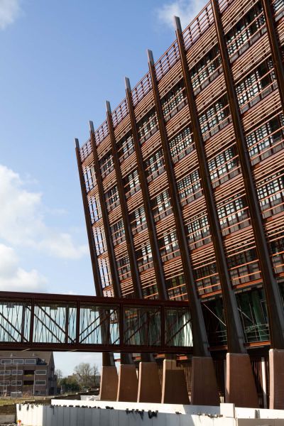 Tekst: <p>Le complexe du nouveau campus à Bruges est recouvert d’une toiture en acier monumentale qui se transforme, le long de la voie rapide, en façade avec bardage en zinc de couleur anthracite. La structure du toit est en acier afin de pouvoir franchir de grandes portées au moyen d’une construction légère. Les fermes en acier - structure en treillis - sont portées par des colonnes en béton assurant la stabilité nécessaire. La structure en acier dans son ensemble mesure 169 m de long, 50 m de large, 24 m de haut et pèse 598 tonnes. Dans la grande cage d’escalier, les poutrelles de toiture et les colonnes font office d’arêtiers, accentuant ainsi la finesse et l’ouverture de ce campus. Cette sensation d’ouverture se retrouve dans la cafétéria, où des arêtiers sont aussi utilisés. Tout le long de l’arrière du bâtiment se trouve un auvent élancé.</p>