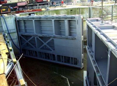 Tekst: <p>Le complexe d’écluses d’Evergem, près de Gand, est situé sur l’une des voies navigables les plus fréquentées de Belgique. Afin de permettre un trafic sûr et fiable, aussi bien pour le transport que pour la navigation de plaisance, les autorités ont décidé de moderniser les infrastructures existantes. Une partie de la rénovation concerne les 12 portes d’écluses en acier, de type busquées, qui intègrent des caissons. Chaque porte a une hauteur de 8,4 m, une largeur de 14,1 m et pèse 62 tonnes.<br>