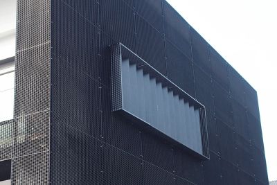La nouvelle extension, un volume entièrement vitré, s’enveloppe dans une peau réalisée en caillebotis d’acier galvanisé. Cette peau permet de garantir une certaine intimité pour les bureaux tout en offrant un maximum de lumière et en évitant l’éblouissement et les surchauffes. La disposition des panneaux de caillebotis s’inscrit en rupture des alignements rigoureux du bâtiment protégé, créant ainsi des jeux d’ombre et de lumière sur les façades.