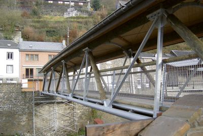 dans la stabilisation de l’ensemble, car suite aux dégradations causées par les multiples inondations et l’absence de maintenance pendant des décades, la pile centrale et les culées en pierre naturelles risquaient de s’écrouler. <br>