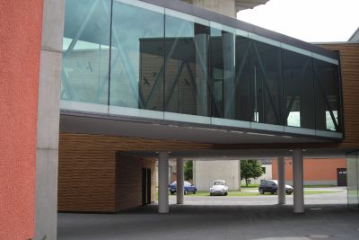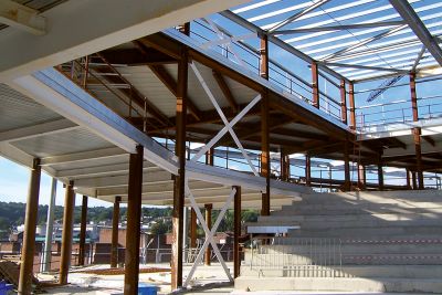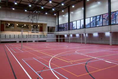 La salle multifonctionnelle peut accueillir jusque 980 personnes. Les structures existantes en béton étant irrégulières d’aspect et inaptes aux nouvelles surcharges, l’idée de l’architecte a été de les envelopper par une structure apparente de renforcement en acier. <br>