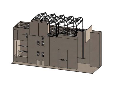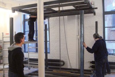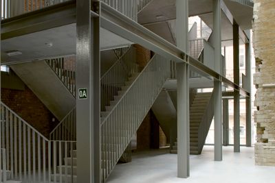 Comme le bâtiment devait également abriter un atelier d’artiste, il avait été demandé d’y prévoir des espaces libres à l’intérieur. Pour réaliser ces nouveaux aménagements sans porter atteinte à l’enveloppe, et tout en veillant à ne pas surcharger les fondations existantes, on opta pour une construction en acier. En raison de leur légèreté et de la référence claire au passé industriel, des planchers collaborants furent installés. Ces planchers furent en outre exécutés en utilisant les poutrelles principales sous-jacentes afin de réaliser des sections de profilés minimales et d’utiliser les matériaux de façon optimale.