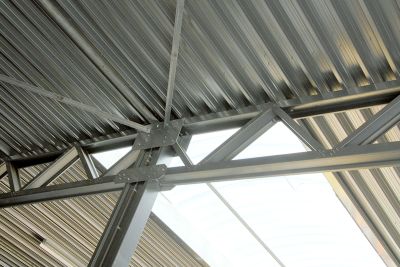 La charpente est un système de poutres sous-tendues constitué de 2 poutrelles IPE 600, de poinçons réalisés en tubes rectangulaires 200 x 100 mm et de 2 tirants en plats de 100 x 30 mm disposés de part et d’autre des faces des poinçons. Ces poutres sont en appui simple sur les poteaux. La stabilité est assurée par un contreventement en toiture repris sur des voiles ainsi que des palées verticales réalisées en rond plein de diamètre 36 mm. La combinaison d’une structure poutre dédoublée avec sous-tension a permis de créer une structure aérée.<br>