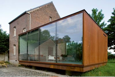 Tekst: <p>Une ancienne ferme située au cœur du Pays de Herve a été entièrement rénovée. Elle accueille, trois appartements et une piscine couverte. Une nouvelle construction se greffe au bâtiment principal existant. Elle est revêtue d’acier autopatinable. Le bardage est en parfaite harmonie avec le cadre dans lequel il s’insère, la teinte rouille s’affichant largement à travers nos paysages tout au long des saisons. L’ensemble est homogène, mais chaque élément porte bien la marque de son époque. L’acier autopatinable a été mis en œuvre aussi simplement que possible : il n’y a pas de débordements, l’ensemble est monolithique, les tôles d’acier sont de grandes dimensions. Le bardage accentue les lignes contemporaines de l’annexe. Il crée un dynamisme géométrique, anguleux et précis. </p>