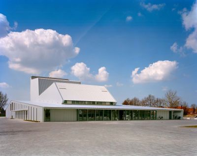Tekst: <p>Ce nouveau centre administratif réalisé à Wolvertem procède de la fusion de différents blocs avec un atrium sur lequel débouchent tous les services. Il symbolise l’ouverture de l’administration communale. La charpente du toit du hall d’accueil et de l’atrium est une structure plate brute en acier complètement entourée de façades en verre. La structure du toit est indépendante et peut se mouvoir librement verticalement par rapport à la façade. La plaque de toiture avec rive en porte-à-faux, est portée par quatre colonnes rondes hautes de 10 m. Les colonnes se terminent en forme d’étoile sous le toit et se déploient tel un parasol. La décharge des eaux pluviales se fait via les colonnes si bien que la pente du toit se dirige vers l’intérieur. La passerelle dans l’atrium est suspendue à la structure du toit par des tirants.