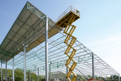 La structure est partiellement fixée au bâtiment existant, ceci afin de pouvoir reprendre les charges horizontales du vent. À l’arrière, la structure repose sur des colonnes. Sur les côtés, on retrouve d’une part une structure de colonnes et d’autre part une colonne en trois parties. Vu cette diversité de points d’appui, chaque treillis travaille de manière différente sur chaque axe.<br>