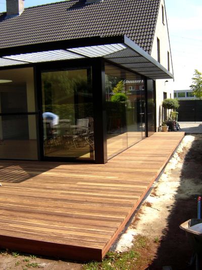 Tekst: <p>La construction arrière d’une habitation datant de l’entre-deux-guerres ne correspondait plus aux attentes du maître d’ouvrage, pas plus qu’aux exigences du confort moderne. L’idée de base de cette transformation était de créer une pièce polyvalente comportant le plus de relations possible et donnant une impression d’espace maximal. La structure en acier présente dans le volume arrière a permis une réalisation complètement nouvelle dans la zone arrière. Le squelette en acier a dans ce cas été complété par une structure en bois pour les parois et le toit. Le toit a été pourvu de deux cadres horizontaux. Ceux-ci permettent à la lumière de pénétrer profondément dans l’habitation existante et donnent chacun une vue différente sur la façade arrière. Le fait d’étendre l’utilisation des matériaux et des couleurs vers l’extérieur a permis de créer une unité d’ensemble qui renforce la relation avec l’extérieur. À l’intérieur, le choix a été fait de dissimuler les parties cuisine et lessive dans des armoires, une manière d’utiliser le nouvel espace pour mettre les diverses activités à l’avant-plan tout en se plaçant soi-même en retrait. </p>
