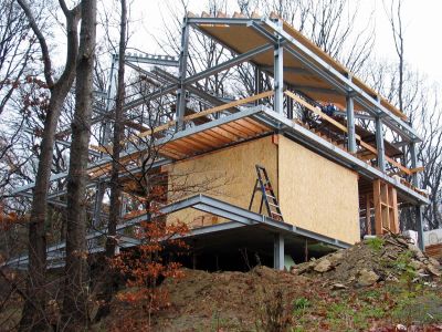 Contrairement aux habitations voisines bâties sur remblais, la maison respecte la topographie existante. Son implantation au niveau du sol naturel, en contrebas de la rue, conduit à une répartition différente de l’espace: les chambres sont au rez-de-chaussée et l’espace de vie, situé à l’étage, jouit d’une vue panoramique sur l’environnement champêtre.<br>Le projet démontre l’adéquation de la construction en acier à l’auto-construction. L’ossature préfabriquée de type industrielle est étudiée en détails pour faciliter les interventions personnelles ultérieures. Sa réalisation en atelier et son montage sont rapides et économiques. Ce processus offre également les avantages d’un chantier couvert.</p>