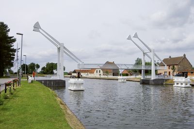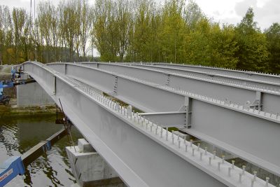 Tekst: <p>À Bocholt, le pont basculant de l’écluse n°18 du Zuid-Willemsvaart devait être entièrement remplacé. Le nouveau pont se compose du tablier basculant, des pylônes portant le contrepoids et des bras de balancier avec la caisse comme contrepoids. Toutes ces parties sont en tôles d’acier de qualité S355 J2G3. Les dimensions du tablier du pont sont de 6 x 10 m. Les pylônes portant le contrepoids ont une hauteur de 6 m. Ce colosse pèse environ 50 tonnes.<br>