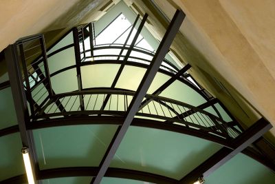 Tekst: <p>Classés Monument national par l’état, les bâtiments de l’ancienne clinique ont été réhabilités en 12 appartements aux étages et en commerces au rez-de-chaussée. L’ancienne cour centrale désormais affectée aux circulations a été couverte d’une verrière. Elle sert d’espace commun sur toute la hauteur de l’immeuble. Les paliers donnant accès aux différents logements associent le métal et le verre. De forme ovale, ils sont détachés des 4 murs de la façade intérieure et incorporent la structure de l’ascenseur sur laquelle ils prennent appui.</p>