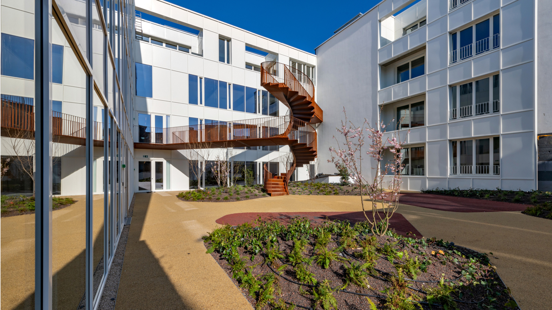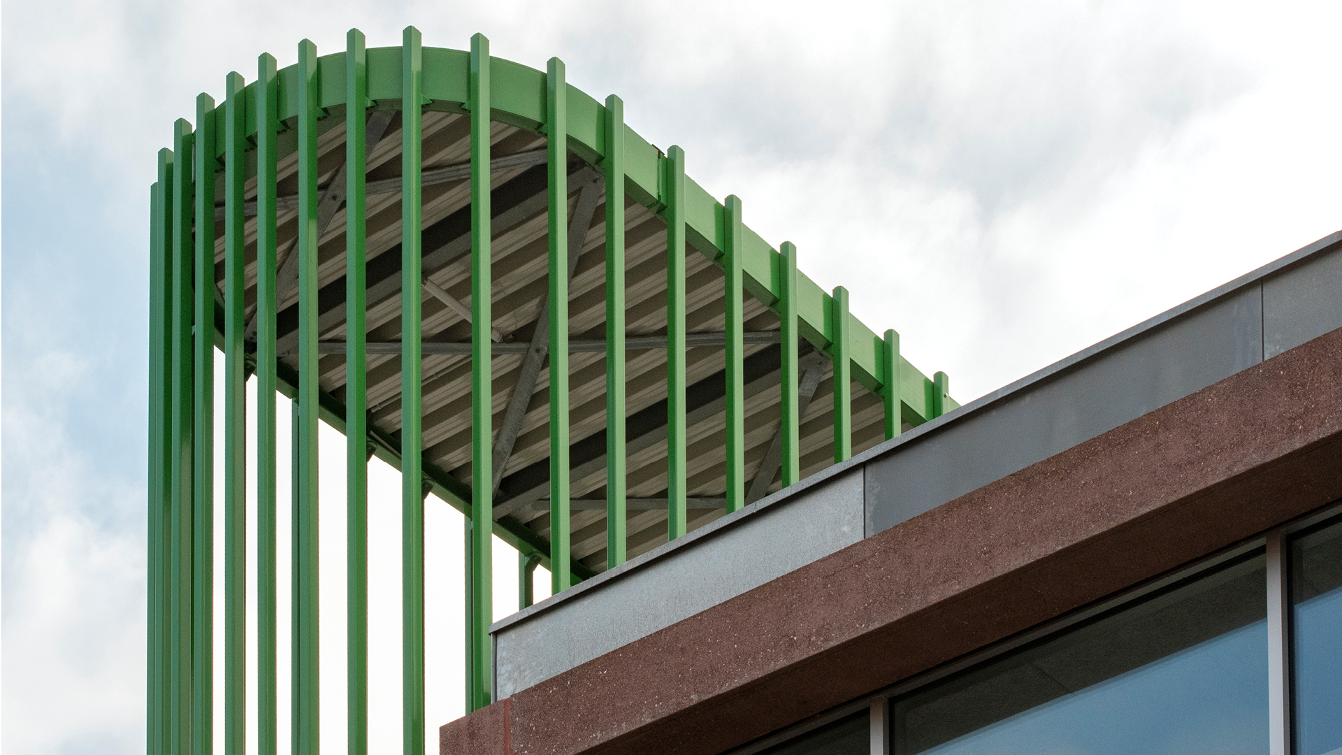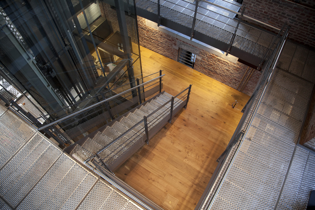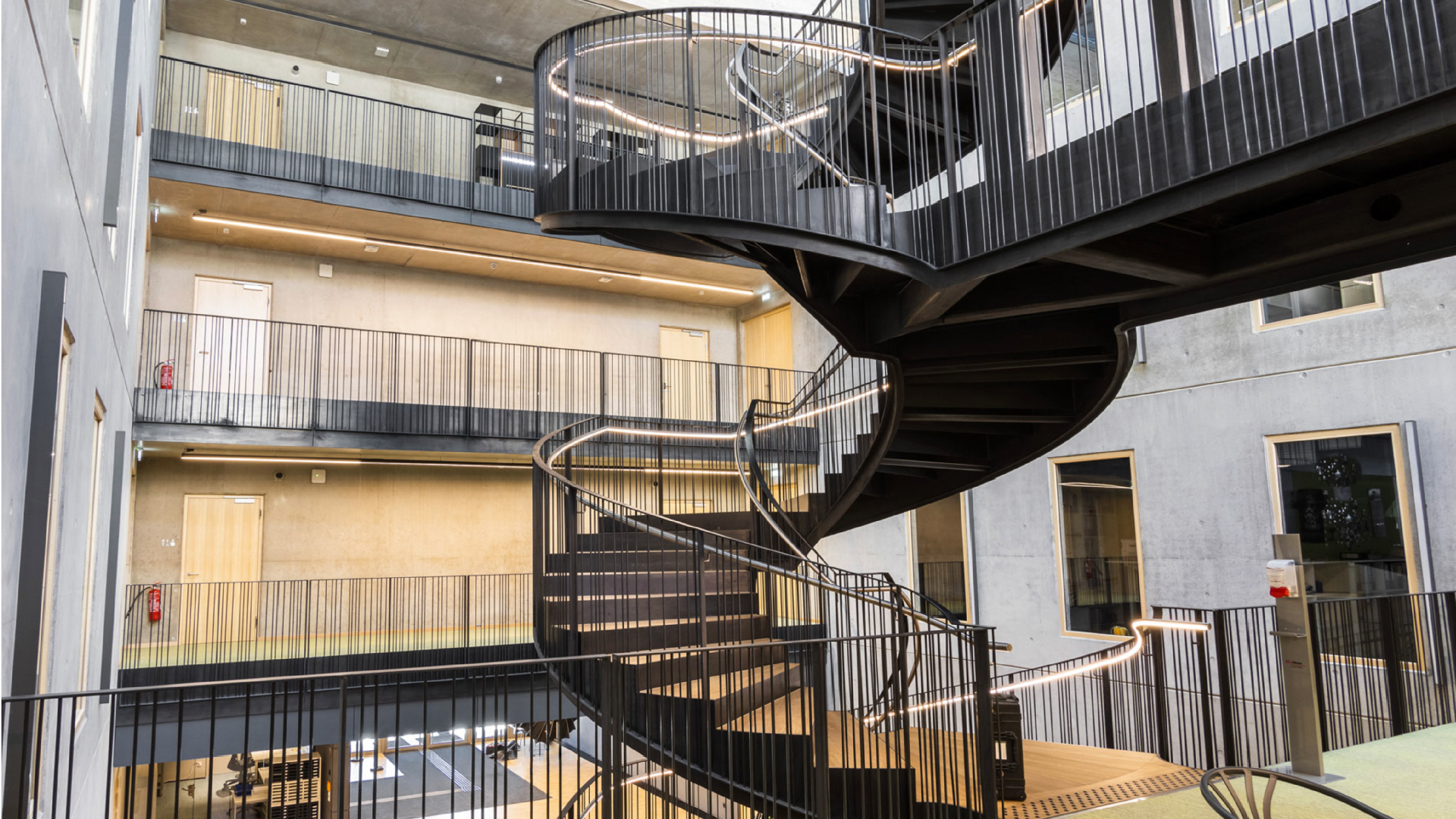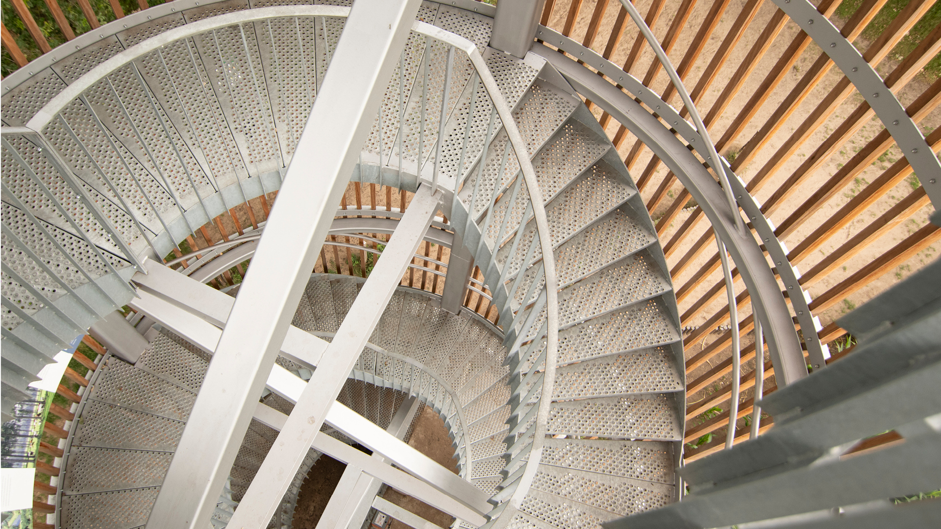 Escalier hélicoïdal en acier auto-patinable à l'ilôt Madeleine
